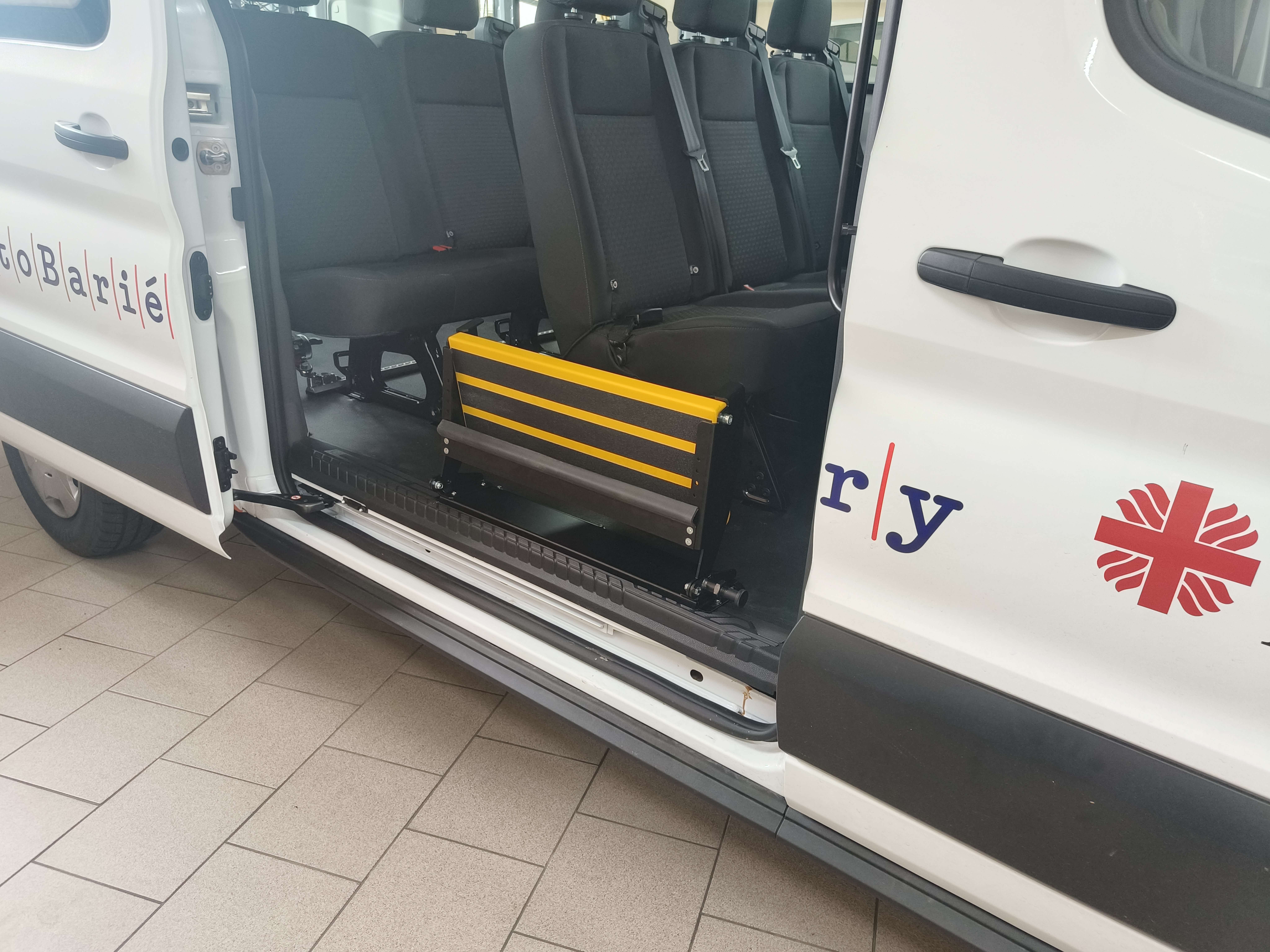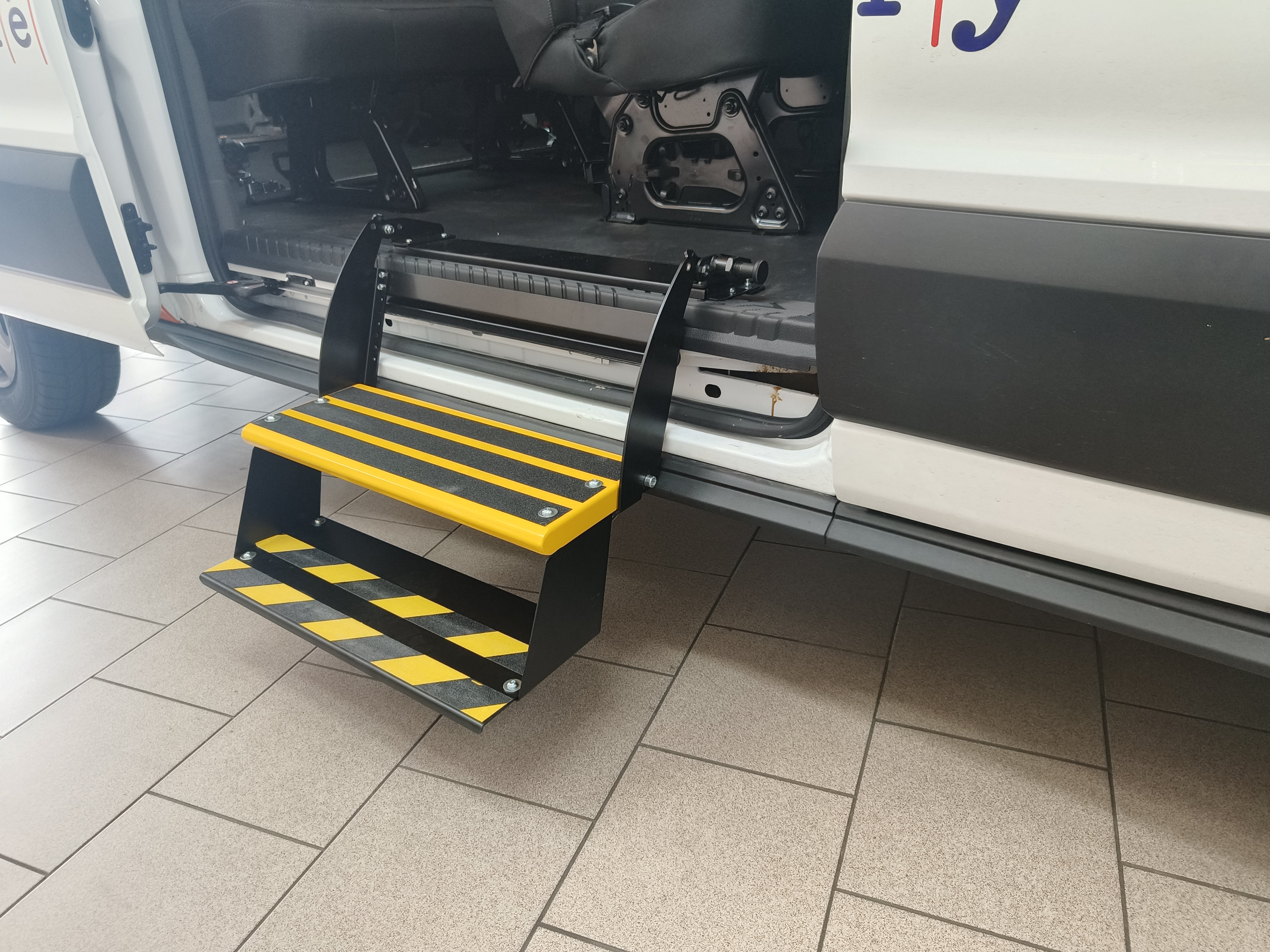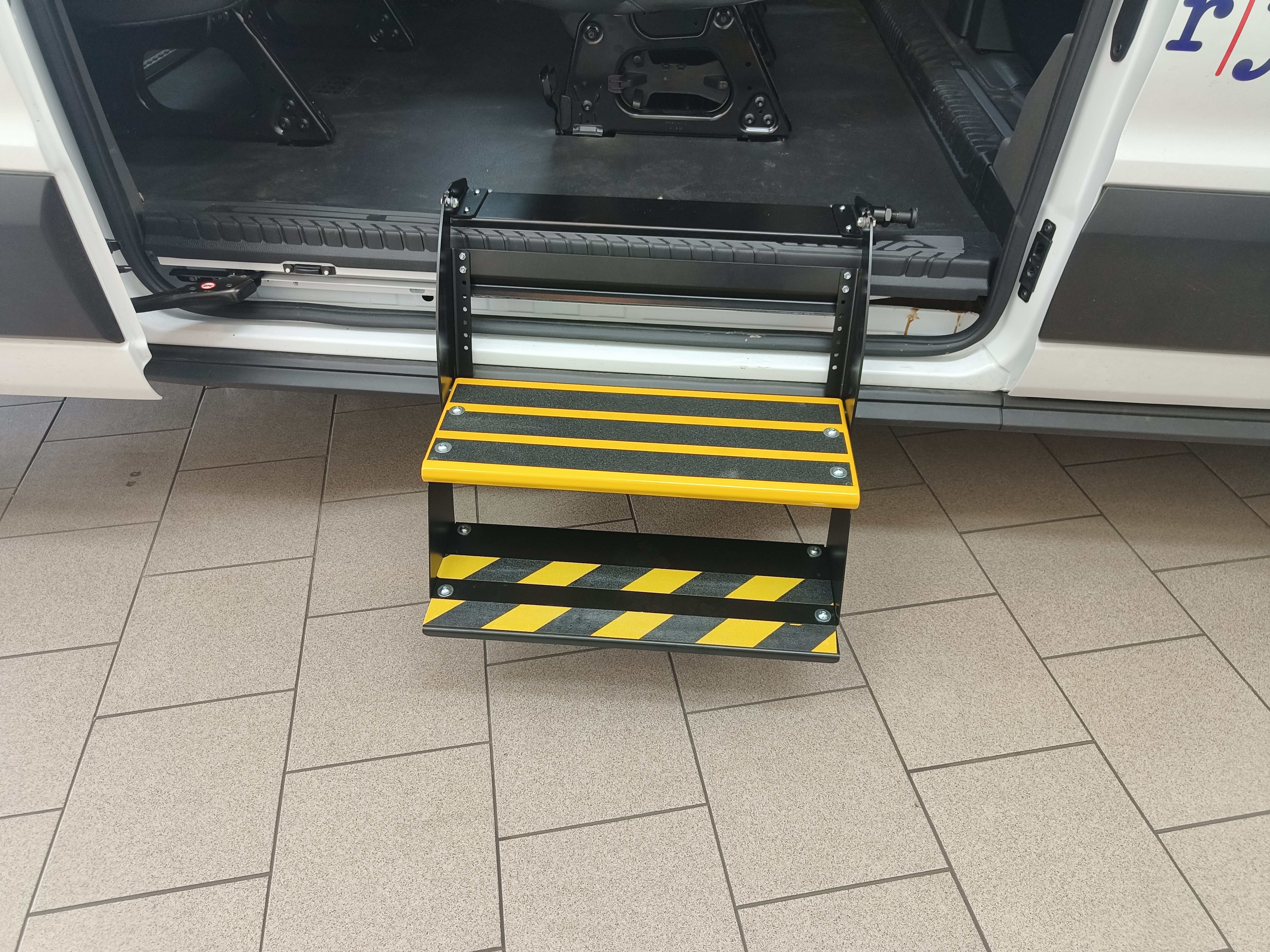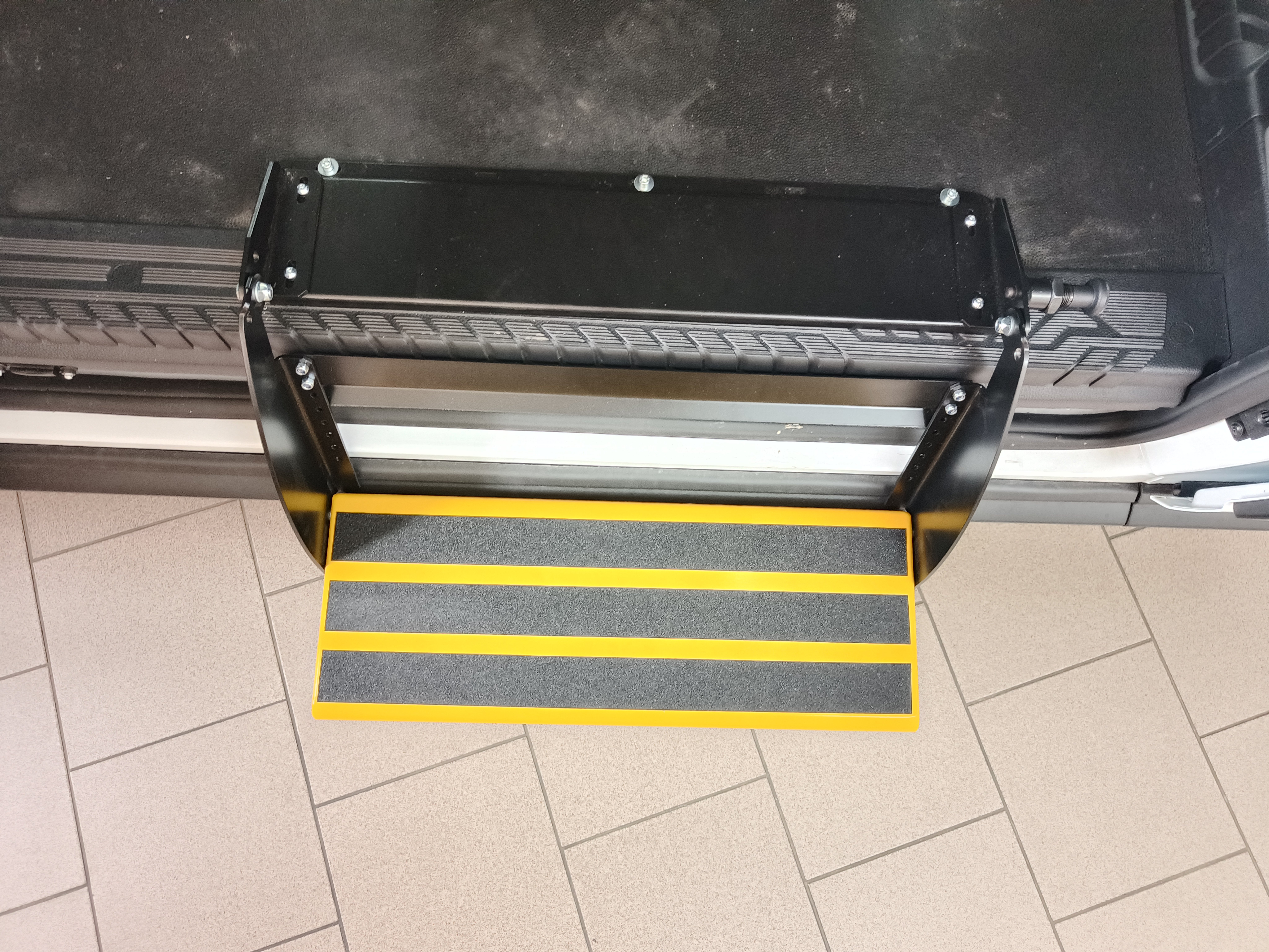 Přídavný nástupní schůdek se používá především u dodávkových vozu pro snadnější nastupování a vystupování do prostoru pro cestující do druhé, popř. třetí rady sedadel. Schůdky můžeme vyrobit skládací na míru do konkrétního vozu. Lze použít i sériově vyráběné vysouvací schůdky elektricky ovládané. Záleží na tom, jaké jsou požadavky zákazníka a co konstrukce vozu umožňuje.